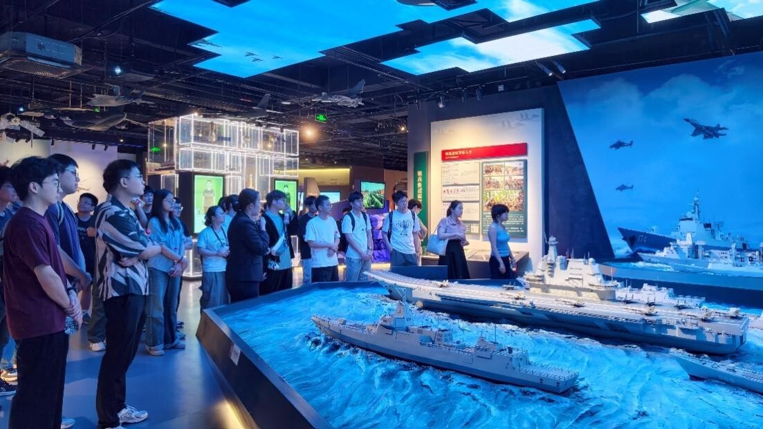 在讲解员的专业引导下,团员青年近距离观摩了航母、洲际导弹等大国重器模型以及退役歼击机、坦克等国防军备实物,系统性学习了我国国防建设从无到有、从弱到强的艰辛历程,以及老一辈科学家为研制“两弹一星”、核潜艇等国之重器隐姓埋名、攻坚克难、科研报国的感人事迹,深刻感受了新时代科技强军的成就以及总体国家安全观内涵。