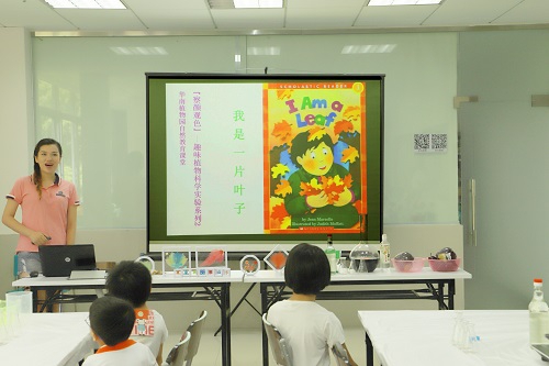 进入科普中心课室,户内课程第一个环节是科普绘本赏析,科普老师与孩子们分享了《我是一片叶子》,绘本言简意赅、充满童趣介绍了叶子殷勤工作的一生,靠空气和阳光为大树提供食物,以其叶脉导管储备水分。无论遭遇毛毛虫叮咬、蜘蛛网缠绕、松鼠蹦跳,仍然不忘使命,工作不息。最后成为落叶,依旧化作春泥!绘本赏析形象准确归纳了叶子的功用,把孩子们对叶子的感性认识带到科学知识的认知层面,也为接下来的进一步实验做好铺垫。
