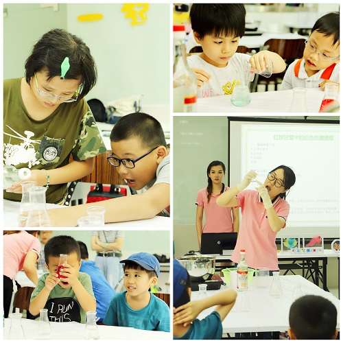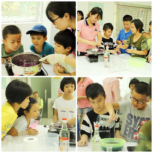 户内的第二环节是植物色素提取小实验,孩子们先将红球甘蓝的叶子放在锅里煮上几分钟,水变成了红色。这是因为红球甘蓝的叶子里含有花青素。在煮的过程中,植物细胞被破坏,细胞中的色素进入水中,把水染红了。接下来是红球甘蓝汁与白醋、苏打水不同组合之后的颜色变化,当红球甘蓝汁与白醋混合后变成了亮红色,与苏打粉溶液混合后变成了碧绿色,与矿泉水混合后先变成红色,然后变成紫罗兰色,下面的孩子们都会发出“哇哇哇”惊讶的声音,脸上都是新鲜神奇的表情,因为每次颜色变化都是即时的,变换后的每一种颜色都是那么鲜明和透亮,造物之中真的蕴藏着许多奥妙。牛顿、爱迪生、法拉第……许多伟大的科学家不就是被这奥妙吸引,而更深的进入神圣殿堂的吗?