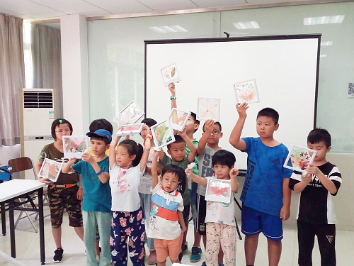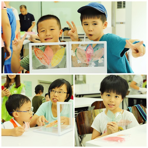 接着孩子们把刷好的叶脉放到不同的颜料盘里染色,他们很珍惜自己作选择的机会,在颜料面前斟酌选定自己中意的颜色。叶脉定色后,经过过塑,修剪,每个孩子都拥有了自己亲手完成的劳动成果。课程最后的叶脉装饰画制作环节,孩子们在老师那里领了橡胶树叶脉和十字形龙船花花瓣,按着心中的设计摆进标本架框,有的设计成孔雀尾巴,有的摆成一棵树,有的像大风车,不一而足。