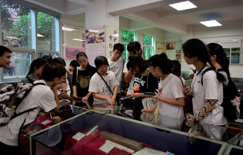 科学家讲解员向同学们介绍了广州地化所的基本概况以及其在学科领域的重要地位及影响力,带领大家正式开始了“环境地学课程之旅”。在科普基地标本馆,同学们立刻被陈列的900余种实物标本所吸引。从经历了低温高压作用的深海沉积物到西北地区形态各异的“沙漠玫瑰”,从云南的自然铜到新疆的古陶片,从宝贵的稀土矿石到色彩缤纷的水晶玛瑙,从侏罗纪、白垩纪的恐龙蛋群体到南海和墨西哥湾的新能源可燃冰,从辽宁的华夏异常鸟到蕴含大量古气象资料的硅化木……从深海区域到西北内陆,从天然矿物矿产资源到人造矿石,从古老的地质年代到最新时期的科学发现,各类标本样品向同学们一一呈现。科普志愿者用科学严谨、通俗易懂的话语向大家细致地讲解着各种矿物岩石标本、古生物化石的来源、特性、用途及研究意义,生动地讲述着自己科学研究和野外科考时的艰辛与趣事。同时结合生态学和环境学知识,还讲解了“生物大灭绝”“生物大爆发”“地球冰期”等地质年代史上的“大事件”。同学们认真聆听讲解并记录要点,与科学家开展热烈的探讨,书本上的知识真实地被展现在同学们的眼前。