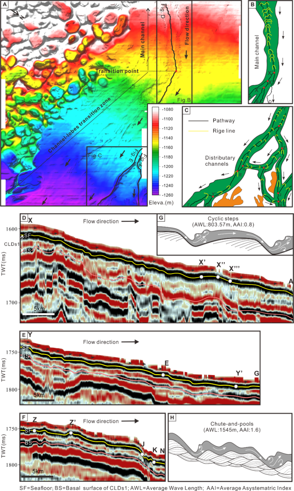 (一) 尽管前人通过水槽实验和露头测量已经建立了浊流底形的理论演化模型,但是,水道-朵叶体转换带(the channel–lobe transition zones,简称CLTZ)内的浊流底形演化很少有文献记载,对其了解也非常少。以南海琼东南盆地高分辨率三维人工地震资料为基础,采用地震沉积学与海底地貌学结合的分析方法,刻画了水深1080-1260米、40公里长的现代海底浊流水系;推进了微地貌尺度的深水浊流底形观测;在CLTZs内,更新了弗洛德数(Fr)整体下降趋势下,局部超临界流动和水力跃变的演化模型。