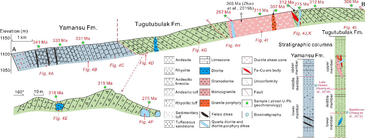 位于新疆东天山的阿齐山-雅满苏铁铜成矿带为弧相盆地并发育有大量的多金属矿床。中国科学院广州地球化学研究所博士生张拴亮在导师陈华勇研究员的指导下,选取带内典型矿床双龙铁铜矿床为中心并设计了完整的连续地层-岩体剖面,通过详细的岩石学、锆石LA-ICP-MS定年和全岩地球化学工作,获得以下认识: