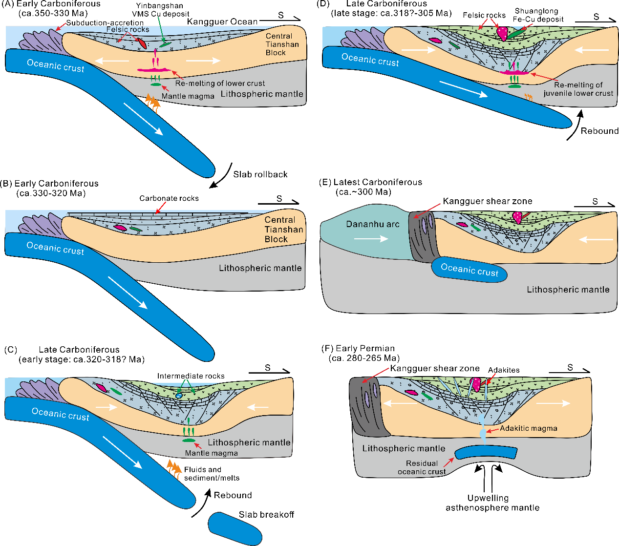 (3)阿齐山-雅满苏带在早石炭纪(ca. 350–330 Ma)经历了拉张成盆并伴随VMS铜矿化,随后经历了短暂的碳酸盐岩沉积期(ca. 330–320 Ma),在晚石炭纪(ca. 320–305 Ma),阿齐山-雅满苏带由拉张状态转变为挤压状态,盆地开始闭合,同时产生大量的花岗岩并伴随IOCG型铁铜矿化。而在早二叠纪,阿齐山-雅满苏带处于后碰撞拉张环境,同时有少量埃达克岩脉侵入。