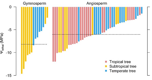 树木的水势是其水分状态的直接表征。树木能否在干旱中存活取决于其水势是否低于其死亡阈值(即致死水势),因而树木干旱响应预测模型必须包含致死水势这一重要参数。该研究分析了全球不同群系59个树种干旱死亡阈值的变异性,发现致死水势的分布范围为?1.5至?14.7 MPa(图1)。平均而言,针叶树的致死水势比阔叶树更低;对于阔叶树而言,热带、亚热带树木的致死水势比温带树木低。
