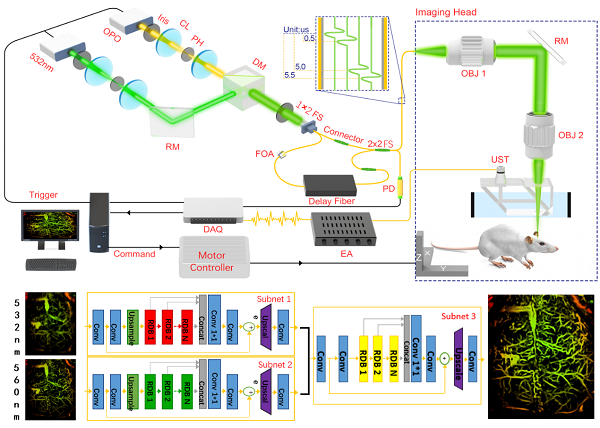 上方为光声成像系统示意图,下方由左到右依次为双波长输入图像、多任务残差密集网络框架、和卷积神经网络输出图像。