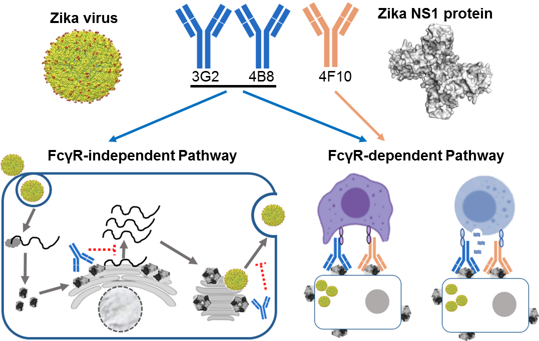 该团队与广州市第八人民医院庾蕾研究员持续合作,利用仔鼠感染模型评估了人源NS1单抗的保护效果,发现了一类特殊的NS1单抗,不仅可通过Fc依赖的途径(如抗体依赖的细胞介导的细胞毒性作用,ADCC)发挥保护作用,还可能经Fc受体非依赖的途径抑制病毒复制。与包膜蛋白(E)抗体不同,NS1单抗不引起ADE风险,值得进一步开发。该成果拓展了对NS1抗体作用机理的认识,为单抗药物及预防疫苗研究提供了新的依据。