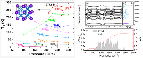 图:TbH10-Fm3m晶体结构及Tb-H化合物超导转变温度(左)和TbH10-Fm3m声子谱、声子态密度、 Eliashberg 谱函数α2F (ω)和电声耦合强度积分(右)