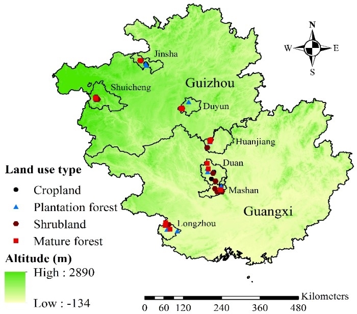 基于此,中国科学院亚热带农业生态研究所环江喀斯特生态系统观测研究站王克林研究员团队以黔桂喀斯特典型水热梯度样带为研究对象,以生态工程实施15年后人工恢复(耕地退耕造林)和自然恢复(耕地退耕植被自然再生)生态系统为研究对象,并以耕地和成熟林为参照(图1),分析了土壤有机碳(SOC)、颗粒态有机碳(POC)和矿质结合态有机碳(MOC)变化特征及影响因子。
