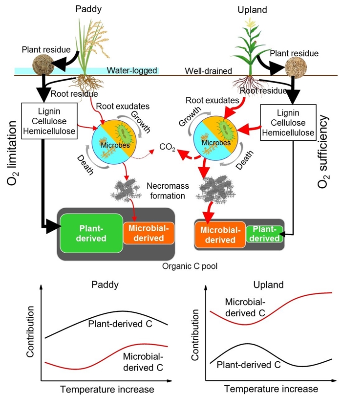 中国科学院亚热带农业生态研究所苏以荣研究员团队在我国东部四个水稻分布气候区(中温带-黑土、暖温带-潮土、亚热带-红壤和热带-砖红壤)采用配对采样原则,随机采集了240对稻田和旱地表层土壤。分析发现,四个区域稻田土壤有机碳固持效率比相邻旱地土壤高39%~127%,且以温暖区(亚热带和热带)差异大于寒冷区(中温带和暖温带)。进一步随机选择40对土壤,基于生物标识物木质素和氨基糖分析,量化植物残体和微生物残留物来源有机碳对土壤有机碳积累的贡献。结果表明,长期耕作以来,稻田土壤固持的有机碳中植物残体来源碳占33%~54%、微生物残体来源碳占28%~36%,而旱地土壤中积累的有机碳植物残体贡献19%~42%,微生物残留物贡献40%~59%。绝对值来看,稻田土壤中植物残体来源碳库大小是旱地土壤的3.3倍。因此,稻田土壤突出的碳固持能力主要是由于淹水限制了微生物活性、抑制植物残体微生物分解过程,促进以植物残体直接积累。从木质素酚和氨基糖的化学组成来看,相较旱地土壤,稻田土壤木质素单体中C/V比高、S类单体的酸醛比低,且真菌和细菌残留物比值低,说明稻田土壤中积累的有机碳稳定性低、易受环境变化或人为干扰而丢失。情景分析表明,若我国东部所有稻田转变为旱地,将造成稻田表层土壤(0~15 cm)中504 Tg有机碳丢失(相当于中国所有农田表层土壤有机碳库的13%),且98%以上发生在亚热带和热带,这些丢失的碳90%以上为植物残体来源碳。研究结果警示了保护亚热带和热带地区稻田和其它人工湿地生态系统的重要性,强调了合理的水分管理是减少稻田土壤有机碳丢失的关键。