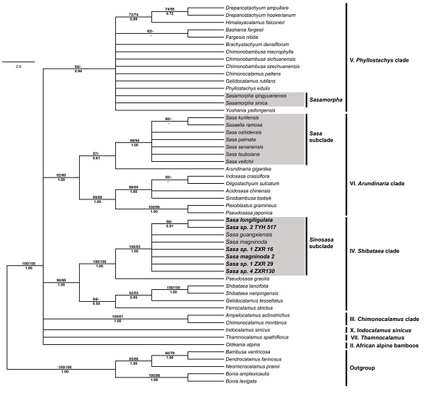 图2. 基于8个叶绿体基因片段建立的系统发育树,阴影部分示赤竹属种类的位置。
