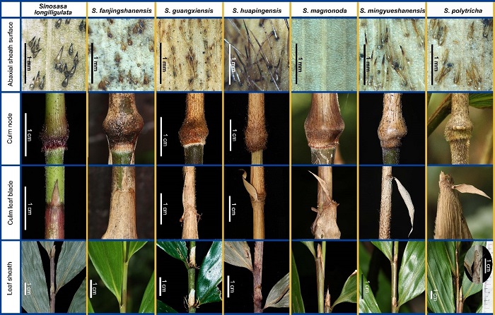 基于以上研究结果,该团队便建立了一新属——华赤竹属(Sinosasa L.C.Chia ex N.H.Xia, Q.M.Qin & Y.H.Tong, gen. nov.)以放置中国赤竹属华赤竹亚属的成员。通过全面的标本整理和野外考察,团队成员系统地研究了中国华赤竹属的植物,结果表明该属目前共有7种,除了先前发表的3种需要重新组合之外,在该研究中还发表了四个新种。该研究解决了中国赤竹属赤竹亚属种类的归属问题,并为将来青篱竹亚族的全面分类修订工作打下了基础。