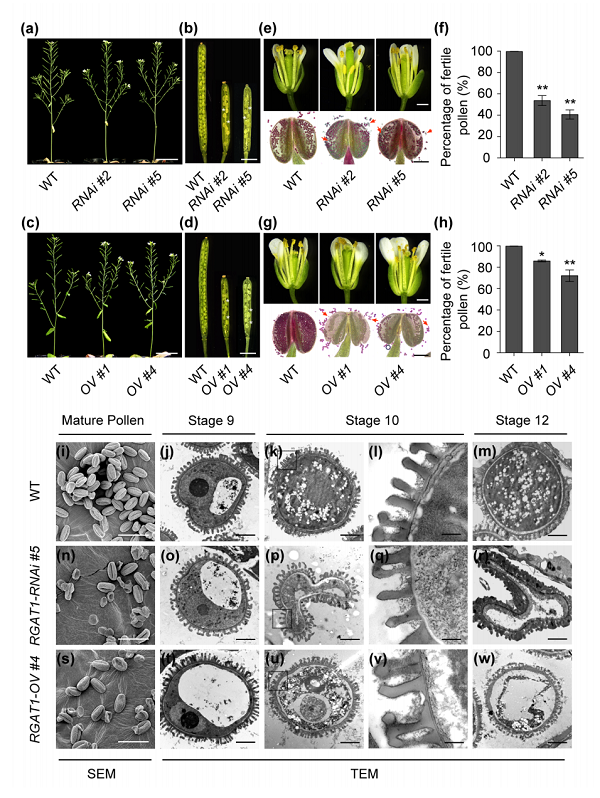 为了探究RGAT1的功能,研究者使用RNA干扰和人工microRNA干扰技术,获得了该基因的突变体。表型分析显示,突变体导致植株早期产生严重的败育情况。有趣的是,35S启动的过表达植株也产生了相类似的表型。扫描电镜和投射电镜观察显示:RGAT1的功能丧失和过表达植株均能导致绒毡层发育异常,从而产生花粉败育和短角果的表型。在RGAT1敲除和过表达植株中,花粉败育发生在第10阶段。并且,RGAT1功能丧失导致绒毡层细胞过早降解,而RGAT1的过表达则延迟了绒毡层细胞的降解。