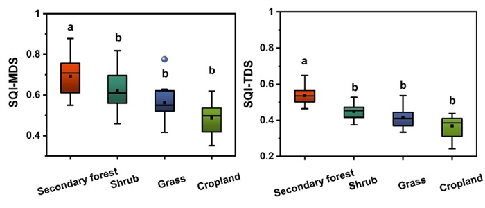 中国科学院亚热带农业生态研究所徐宪立研究团队在我国贵州省普定县陈旗小流域以空间代替时间的方法,选取次生林、灌丛、草地和耕地(对照)等四种典型植被演替阶段的土壤为研究对象,分析土壤的理化指标,考虑喀斯特区土壤浅薄这一特性另采集土壤厚度指标,通过构建基于全数据集法(TDS)和最小数据集法(MDS)的土壤质量指数(SQI)对不同演替阶段的土壤质量进行评估。