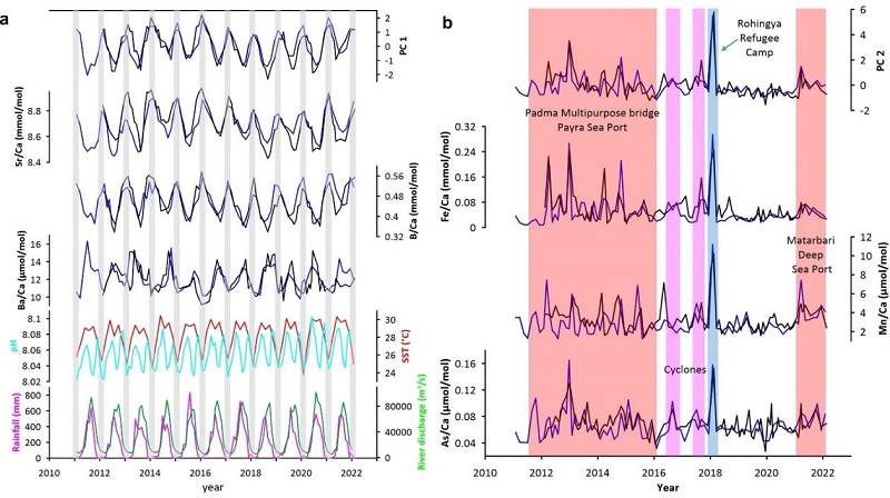 研究团队创新性地利用圣马丁岛的现代和古珊瑚样品作为高分辨率自然地质档案,建立了 2011 — 2022 年间的多元素(B、Fe、Mn、Ba、Cu、Ni、Pb 等)时间序列,精准甄别了不同人类活动的污染指纹。研究结果显示,珊瑚骨骼中微量元素的变化不仅清晰记录了海表温度与河流径流的季节性信号,更反映了沿岸城市化、农业化与工业化快速发展带来的污染累积。多元统计分析表明,约七成的元素变化可归因于人类活动。其中,铁、锰、砷的峰值与帕德玛大桥、马塔巴里深水港等大型基建工程以及建立罗兴亚难民营引发的土地利用剧变等高度吻合;磷、锌、镉的长期上升趋势则指向了农业化肥的使用加剧;而锡的异常则揭示了防污漆、农药及旅游业等污染源的贡献。珊瑚中铜、镍、铅等金属含量较前工业时期升高 2 至 3.5 倍,明确地将这些重金属的富集与吉大港全球性拆船产业的活动强度直接关联,并确定了每种金属输入的特定阈值,为针对拆船业的精准监管和风险预警提供了量化工具,也为我国参与国际合作框架下的区域治理(如《香港公约》等)提供数据话语权。