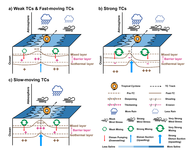 本研究从“降水淡化增强层结”与“风致混合削弱层结”的竞争关系出发,构建了统一的物理框架,系统解释了TC强度与移动速度如何共同调控障碍层厚度的演变过程。研究结果不仅调和了以往研究中的分歧认识,也为深入理解TC—海洋相互作用机制提供了新的视角。本成果有助于提升对TC作用下上层海洋结构变化的认识,并为改进TC强度预报提供科学依据,对防灾减灾及气候变化背景下的极端天气研究具有重要意义。
