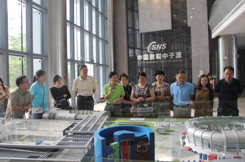 奚基伟陪同来宾们观看了工程沙盘和宣传片,介绍了CSNS工程的建设情况和科学原理,并通过CSNS工程报告,详细介绍了工程的基本情况和应用价值。