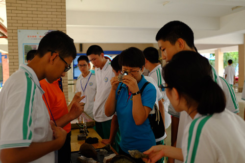 广州地化所科普基地充分发挥地球科学和环境科学的资源优势,围绕全国科普日主题,向学校师生展示了琳琅满目、不同地质年代的岩石标本,低等到高等古生物进化化石标本,和石油、煤、红蓝宝石原矿、铅锌矿、黄铁矿、黄铜矿、天然水晶、冰洲石等与大众生活密切相关的代表性矿产资源标本。此次活动还特别展示了数块与“可燃冰”有密切关系的采自墨西哥湾和台湾的冷泉碳酸盐岩岩石以及南海神狐海域含天然气水合物的沉积物样品。