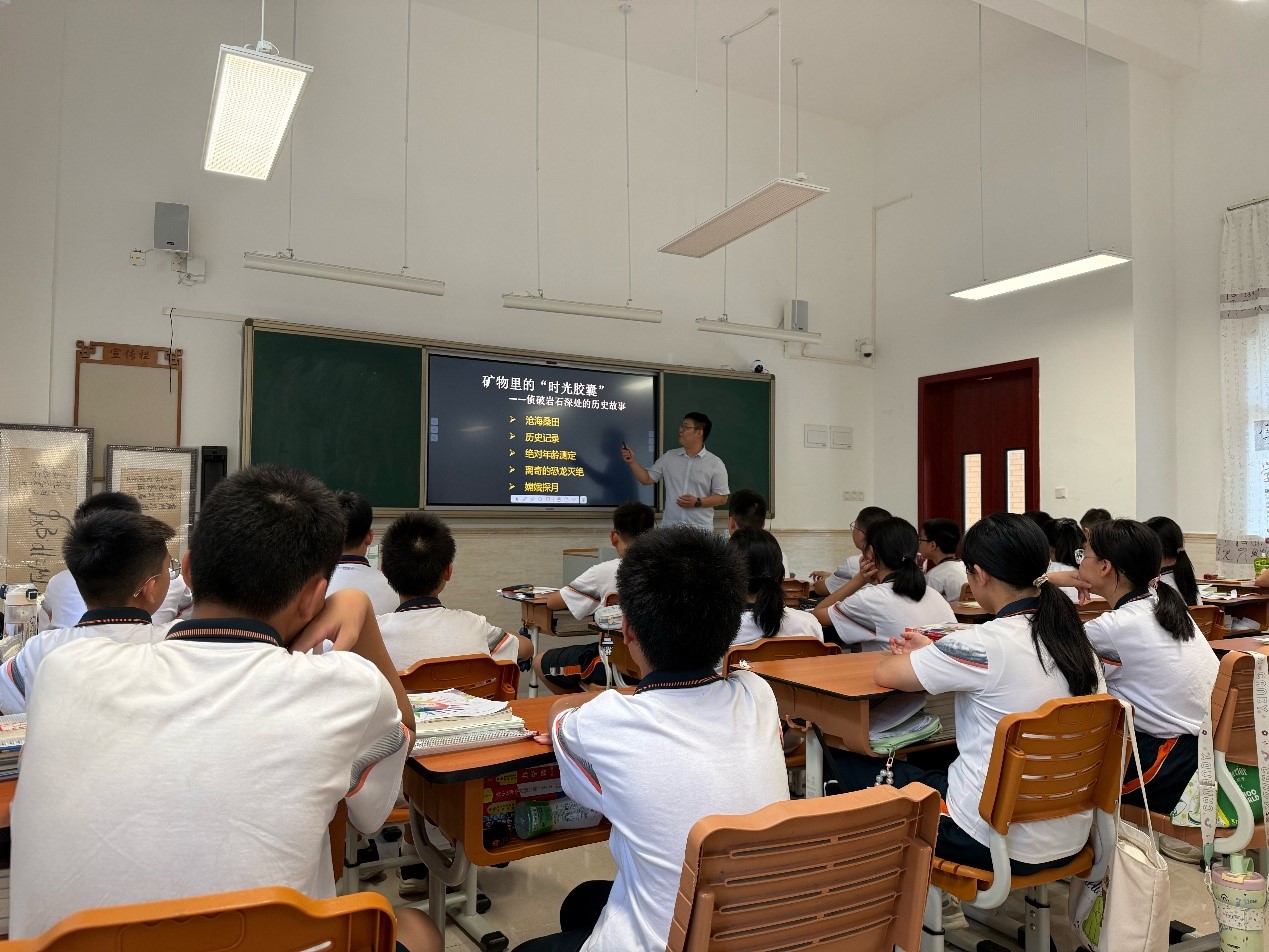 10月15日,中国科学院广州地球化学研究所科普进校园活动走进广州外国语学校,张万峰高级工程师为学校初二年级物理竞赛集训班带来了一场题为《矿物里的“时光胶囊”——侦破岩石深处的历史故事》的科普报告。整场报告内容生动、趣味盎然,为同学们呈现了一场知识与灵感交织的科学盛宴。