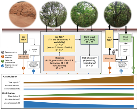 近日,中国科学院华南植物园恢复生态学团队在热带造林碳汇研究方面取得重要进展。研究发现,在热带退化海岸台地进行多树种混交造林比单一树种人工林能更有效地促进土壤有机碳的积累,而土壤中磷元素的活化与可利用性提升是这一过程的关键驱动因素。图1. 不同造林方式下土壤有机碳(SOC,a)、微生物残体碳(MRC,b)、铝/铁结合态有机碳(Al/Fe-SOC,c)、木质素与酚类相对丰度(d)、MRC占SOC比例(e)及Al/Fe-SOC占SOC比例(f)。样地类型包括:裸地(BL)、桉树人工林(EP)、次生混交林(SF)和天然林(NF)。研究团队基于小良热带海岸生态系统定位研究站长达60年的植被恢复序列,选取——裸地、桉树纯林、混交次生林和天然林四种典型植被类型,系统比较了其土壤有机碳、养分含量、微生物特性及碳组分构成。结果显示,经过60年的恢复,混交林的土壤有机碳含量比裸地提高了68.2%,而桉树纯林仅提高36.5%,显示出多物种森林在碳积累方面的显著优势。进一步分析发现,混交林中土壤磷的有效性显著高于纯林,表现为更高的有效磷含量和更低的磷单酯/二酯比值,表明其磷循环更为活跃。同时,混交林中的土壤微生物群落结构也发生了明显变化,丛枝菌根真菌比例上升,微生物对磷的需求增强,进而通过分泌酸性磷酸酶等机制促进土壤中磷的活化。图2. 桉树人工林(EP)与混交次生林(SF)土壤剖面中磷库结构:脂肪族指数(a)、难分解性指数(b)、正磷酸盐磷在总磷中的占比(c)及单酯磷与双酯磷比值(d)。研究还指出,混交林中植物与微生物之间的相互作用更为密切,植物通过根系分泌物和菌根网络促进磷的迁移与利用,而微生物则通过提高周转和促进微生物残体碳的积累,共同推动土壤有机碳的形成与稳定。图3. 混交林通过增强磷有效性与调控微生物群落促进土壤碳积累的机制。该研究系统阐明了热带海岸台地造林过程中“树种多样性—土壤磷有效性—微生物过程—土壤碳积累”之间的联动机制,强调了在热带退化地区造林时应优先选择多树种混合配置,并重视土壤磷素的动态监测与管理。研究人员建议,未来热带森林恢复项目应注重树种搭配,尤其是引入具有固氮能力的树种,以增强土壤养分循环,激活微生物群落,从而实现更高效、更持续的土壤碳汇增汇与生态系统恢复目标。这项研究不仅深化了对热带森林碳—磷耦合机制的理解,也为全球气候变化背景下的森林管理与生态修复提供了实践路径。相关研究成果以“Accelerated soil carbon accumulation in an afforested multispecies forest compared with a monoculture driven by larger soil phosphorus mobilization”为题发表在国际学术期刊Journal of Environmental Management(《环境管理杂志》)上,中国科学院华南植物园鹤山站助理研究员李悦为论文第一作者,刘占锋研究员为通讯作者。研究获得了广东省基础与应用基础研究旗舰项目和国家自然科学基金等资助。论文地址:https://doi.org/10.1016/j.jenvman.2025.127955