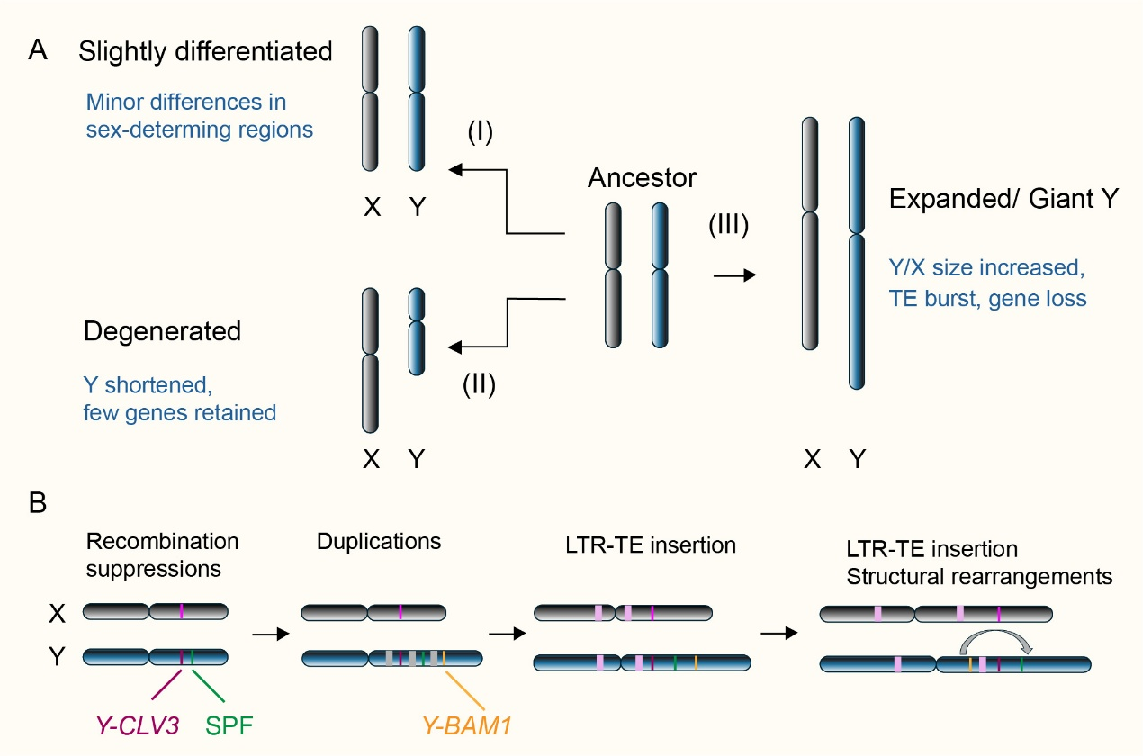 有性繁殖是生命世界的主流。与高等动物性别相对固定不同,植物的“性别表现”可谓花样百出。然而,为了最大限度地促进不同个体间的杂交,避免“近亲结婚”,一些植物演化出了与动物类似的雌雄单性的策略—即一株植物只开雌花,另一株只开雄花。虽然这类植物在种类上不算多数,但它们却广泛分布在超过一半的被子植物科中,说明这种策略在演化史上独立发生了许多次。近十年来,随着基因测序技术的飞速发展,科学家们得以深入解析许多植物的性别决定机制和性染色体演化。植物的性别决定方式主要有三种:XY型、ZW型和UV型。其中,XY型最为常见。顾名思义,雄性个体携带X和Y两种不同的性染色体,而雌性则有两条X染色体。在植物中,XY型性染色体的形成可以经历三种主要途径(图1-A):同型性染色体阶段—X和Y染色体仍很相似,大部分区域可以自由重组;异型性染色体阶段,Y染色体可能因为长期缺乏重组而积累突变、重复序列或转座元件,并且发生基因丢失,最终变得巨大或退化。在石竹科的蝇子草属(Silene)植物中,科学家详细研究了巨型Y染色体的起源与演化。以Silene latifolia为例,它的Y染色体约有5.1亿碱基(510 Mb),比许多植物整个基因组还大。研究发现,该物种的X和Y染色体之间的重组抑制并非一次发生,而是逐步形成,就像地质学中的地层一样,留下了清晰的“演化层”。根据同源基因的比较,三个演化层的分化时间分别约为1180万年、540万年和440万年前。在最古老的一层中,Y染色体上超过70%的基因已经丢失,而靠近假常染色体区域(PAR)的基因则保存得较好。经典模型认为,植物性别的形成通常需要两个关键突变:一个突变促进雄蕊发育(雄性功能);另一个突变抑制雌蕊发育(雌性功能)。在Silene latifolia中,科学家找到了与这两个功能相对应的候选基因—SlCLV3(雌蕊抑制因子)和TWD1等(雄蕊促进因子)。这证实了“两次突变模型”在植物雌雄异株形成中的合理性。基于这些发现,科学家提出了Silene latifolia Y染色体逐步演化的模型(图1-B):最初,性别决定基因和某些相关基因都位于一个普通的染色体上,还能自由交换基因。为了将有利的基因组合“捆绑”在一起,自然选择首先“冻结”了核心区域(演化层S1)的基因交流。随后,这种“冻结”效应像涟漪一样向外扩张,每一次扩张都伴随着染色体结构的重排。每一个新形成的“演化层”都开始显现退化的迹象:转座元件大量堆积、有用基因逐渐丢失、重复序列不断扩张,最终塑造了我们今天看到的庞大而复杂的Y染色体结构(见图1-B)。植物性染色体的研究已达到与动物系统相当的精细水平。科学家们越来越认识到,性染色体的演化并非单一模式,而是一个由多种途径、不同时间尺度和复杂机制共同塑造的动态过程。在这其中,仍有若干关键问题尚待解决。(1)基因剂量补偿问题:在动物中,通常存在平衡性染色体基因表达的机制,但在植物中,这种补偿机制是否普遍存在仍不清楚。(2)性别拮抗选择的证据缺乏:在理论上,性别相关基因之间的“冲突”被认为推动了重组抑制的产生,但植物中的直接证据十分有限。(3)XY与ZW系统的演化偏向:被子植物中既有雄性异配型(XY)也有雌性异配型(ZW),但为何某些谱系偏向某一种系统,仍是一个谜。未来,随着更多植物物种的基因组被测序,研究者将进一步揭示植物性别决定和性染色体的演化规律。这不仅有助于我们更深入地理解生命多样性的起源,也将为关键农作物的育种和气候变化下物种存续提供新的启示。相关研究结果以“Understanding the evolution of giant Y chromosomes and sex determination mechanisms in plants” 为题,作为评论文章发表在学术期刊Science China. Life Science(《中国科学:生命科学》)上。中国科学院华南植物园袁帅副研究员为论文第一作者,袁帅副研究员和罗世孝研究员为论文共同通讯作者。文章链接:https://link.springer.com/article/10.1007/s11427-025-3080-2图1. XY系统中Y染色体的演化路径,包括巨型Y染色体形成途径。(A)Y染色体的三种广义演化路径;(B)Silene latifolia 巨型Y染色体形成过程示意图。