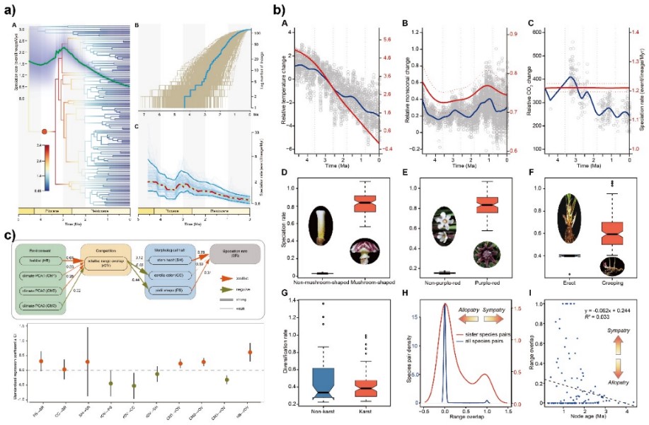 解析全球生物多样性在不同时空尺度上的形成机制是当前进化生物学中的重大科学问题之一,其核心是要揭示物种快速分化的驱动力。当前,主要有两种观点分别从生物与非生物因素方面来阐述物种快速分化的驱动机制。“宫廷小丑”模型(Court Jester model)认为非生物因素(如气候波动、造山运动等)对大尺度的物种分化起主导作用,而“红皇后”模型(Red Queen model)则认为生物因素(如性状创新、生物间相互作用等)是促进物种快速分化的主要驱动力。但毫无疑问,在生命的长河中,生物的宏演化是受到了多种生物和非生物因素的共同作用。然而,以往的研究绝大多数往往仅聚焦在某一个或一类因素方面,尤其忽视了多种因素之间的协同作用,即多种非生物与生物因素通过时空耦合共同塑造多样化格局。蜘蛛抱蛋属(Aspidistra;又称为一叶兰)是单子叶植物天门冬科(Asparagaceae)的一个大属。当前,该属中已发表了超过200个物种,主要分布在亚洲的热带、亚热地区,尤其是中越边境的喀斯特石灰岩地区是其物种多样性的中心。这个属除了具有丰富的物种多样性之外,其物种的地理分布式样和花形态多样性也呈现出显著的特点,如广泛的邻域及同域分布,丰富的柱头拟态性状。蜘蛛抱蛋属的这种地理分布模式一方面预示着生态物种形成的普遍存在,另一方面也暗示着物种间的竞争对其分化具有重要作用。另外,蜘蛛抱蛋属极其丰富的花性状多样性也间接地反映了传粉者选择对该属物种分化的作用;尤其是,其与蕈蚊的传粉—哺育互利共生关系可以快速地促进双方的快速分化。由此可见,蜘蛛抱蛋属的物种分化可能受到多方面的生物与非生物因素的影响,但当前人们对该属进化历史的认识还知之甚少。科研团队通过对123种蜘蛛抱蛋属物种进行了简化基因组测序,并重建该属迄今取样最多、分辨率最高的系统发育树。基于该稳健的系统发育框架,研究团队估算了该属的分化时间,并基于多种方法分析了该属物种形成速率演化动态。结果显示蜘蛛抱蛋属为一个年轻的类群,其起源于中新世和上新世的边界期(5.49 Ma;95% HPD: 3.8–7.57 Ma),在上新世暖期(Mid Piacenzian Warm Period;2.6–3.6 Ma)其物种分化速率显著加快,达到2.27个物种/百万年(图2a)。这一物种形成速率超过旧世界植物区系中所有已报道的物种形成速率。这也预示着蜘蛛抱蛋属代表着旧世界植物区系中物种分化速率最快的类群之一。研究团队进一步利用多种统计模型解析了蜘蛛抱蛋属物种快速分化的驱动力,发现包括古温度、东亚季风变化、物种竞争及传粉共生等多种生物与非生物因素可以同时独立又协同地促进蜘蛛抱蛋属的物种形成及快速辐射(图1-b,c)。 图1. 多种生物与非生物因素协同作用于蜘蛛抱蛋属的物种分化 图2. JIPB第67卷11期的封面中国科学院华南植物园康明研究员团队和广西壮族自治区中国科学院广西植物研究所林春蕊研究员等合作研究成果以题为“The interplay of abiotic and biotic factors likely drove one of the fastest plant radiations from tropical-subtropical Asia”近期发表在国际学术期刊Journal of Integrative Plant Biology (JIPB)(《植物学报》) 上。该研究为理解植物物种快速分化提供了新的见解,并被选为期刊当期封面故事(图2)。中国科学院华南植物园杨丽华博士为论文的第一作者,康明研究员和广西植物研究所林春蕊研究员为论文共同通信作者。法国国家科学研究中心蒙彼利埃进化科学研究所Fabien L. Condamine研究员和广西壮族自治区中国科学院广西植物研究所刘演研究员参与了论文的指导工作。该研究得到了广东省基础与应用基础旗舰项目、中国科学院战略生物资源计划项目和国家自然科学基金项目的资助。文章链接:https://onlinelibrary.wiley.com/doi/10.1111/jipb.70031