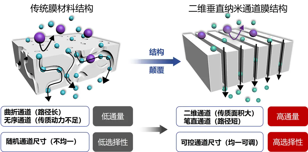 一张“离子膜”,如何影响世界?近日,中国科学院深圳先进技术研究院研发的“二维垂直亚纳米通道膜技术”荣获全国颠覆性技术创新大赛优胜奖。该技术通过构筑颠覆性的“二维垂直亚纳米”通道结构,破解了膜法离子分离领域长期存在的“选择性”与“通量”不可兼得的国际难题。一张“离子膜”,如何影响世界?近日,中国科学院深圳先进技术研究院研发的“二维垂直亚纳米通道膜技术”荣获全国颠覆性技术创新大赛优胜奖。该技术通过构筑颠覆性的“二维垂直亚纳米”通道结构,破解了膜法离子分离领域长期存在的“选择性”与“通量”不可兼得的国际难题。在能源、环境、水资源等领域,离子分离膜是决定装备“性能上限”和“成本下限”的“芯片”。然而,传统离子膜因其亚纳米通道难以精准构筑,导致膜材料长期面临一个难以逾越的瓶颈:选择性与通量难以兼得。膜材料要实现精确筛分,就得牺牲传质速率;想要快速传质,就难以保证筛分精度。从“0”到“1”的原始创新,是破解膜材料领域“高选择性与高通量无法兼得”这一国际难题的有效路径。中国科学院深圳先进技术研究院成会明、丁宝福、罗杰及团队成员聚焦“高选择性兼高通量膜材料”这一科技制高点和产业高地,在深圳先进院国际上原创大面积构筑“二维垂直亚纳米通道膜”的颠覆性膜结构。团队4年磨一剑,实现了“狭缝式”二维垂直亚纳米通道的有序组装和突破了相关通道构筑的理论、技术、材料、工艺难点,相关技术连续在2024年及2025年两获得京津冀国家技术创新中心组织的颠覆性技术大赛优胜奖,并与近期联合中煤(深圳)研究院有限公司获得国家重点研发计划-颠覆性技术创新专项的支持,也是深圳先进院首个获批的颠覆性技术创新专项项目。这种基膜的突破,还有利支撑了多种含水处理膜、储能用离子膜等功能膜的性能瓶颈的突破,并在2025年度内,连续获得了中国科学院抢占科技制高点攻坚计划子课题、深圳市科技重大专项等重要纵向项目的支持,凸显了其巨大的创新潜力与产业价值。“二维垂直亚纳米通道膜”技术的颠覆性,始于对膜材料最根本“原理”、“结构”、“工艺”的重构。结构颠覆:从“曲折小路”到“垂直高速”传统分离膜内的通道如同蜿蜒曲折的乡间小路,路径长、宽窄不一,导致分子、离子通行效率低且筛分不精准。研究团队首创了大面积构筑“二维垂直亚纳米通道膜”这一颠覆传统膜通道结构的构筑策略。团队创制的膜材料内,具备尺寸精准可控、尺寸均一、笔直垂直的二维纳米通道,为目标物质修建了足够“宽阔”的“垂直高速公路”。这项技术能够在 0.4到1.0纳米(约等于头发丝的五万分之一)的范围内,实现对通道尺寸的任意、均一且垂直取向的精准调控,从而能精准、快速地区分任意两种亚纳米尺寸的离子或分子。技术颠覆:从“分子为中心”到“有序畴为中心”的范式革命为了构筑“二维垂直纳米通道”这一全新的膜结构,团队摒弃了传统 “以分子为中心”的膜材料研发思路和制备工艺,发明了 “以畴基元为中心”的全新制膜技术。这如同从用“无序的砂砾”建房,升级为用“制式规则的砖块”建房,为“跨膜取向二维通道的构筑”奠定的结构学和材料学基础,实现了膜材料研制范式的革新。该技术具备极强的普适性,可适配不同分子结构、化学属性的制膜原料,为针对不同应用场景开发高性能膜材料带来了无限可能。性能颠覆:抢占膜材料性能、技术制高点凭借革命性的结构设计与制备技术,“二维垂直纳米通道膜”在多项关键性能指标上实现了颠覆性突破,全面刷新现有纪录:能源领域:相比进口膜材,质子传导率提升1倍以上,阴离子传导率提升4倍,提升了液流电池、电解水制氢等效率。资源提取领域:用于盐湖提锂时,水通量提升5倍,为绿色、高效获取锂资源提供了高效方案。水处理领域:正渗透海水淡化水通量提升1个数量级,率先实现了无需外加压力的家用净水,节能潜力巨大。产业颠覆:专利布局完善,宏量化路线可行一项真正的颠覆性技术,在于其能否形成从基础研究到产业应用的完整闭环。团队正在朝着这一目标前进:团队已形成完备的研发体系,建立了涵盖“膜理论模拟、材料学、传质学、工程放大、器件开发、应用示范”的完备研发体系和队伍。专利壁垒坚实,围绕核心技术,已申请专利14项,已授权5项,PCT专利2项,形成了坚实的知识产权壁垒。产学研高频联动,技术已成功研发卷对卷制备装备,完成了米级原型膜样品制造,并与多家行业领军企业、研究所签订合作开发与应用示范协议,持续推进产业化步伐。“二维垂直纳米通道”颠覆性膜技术,是深圳先进院坚持面向世界科技前沿、面向经济主战场的生动体现。这项从“0”到“1”的原始创新,不仅为基础科学贡献了新的方向,更以其颠覆性的技术特点,为能源、环境、资源提取等众多关键领域带来了变革性的解决方案。从实验室的原创概念,到大赛的脱颖而出,再到国家重大专项的认可与支持,这条清晰的路径标志着“二维垂直纳米通道膜”技术正加速从实验室走向产业化,有望在未来为解决国家重大需求、推动产业升级贡献“先进院力量”。建立“二维材料液晶”新方向,原创“二维垂直亚纳米通道膜”结构两获“全国颠覆性技术创新大赛优胜奖”及系统化专利布