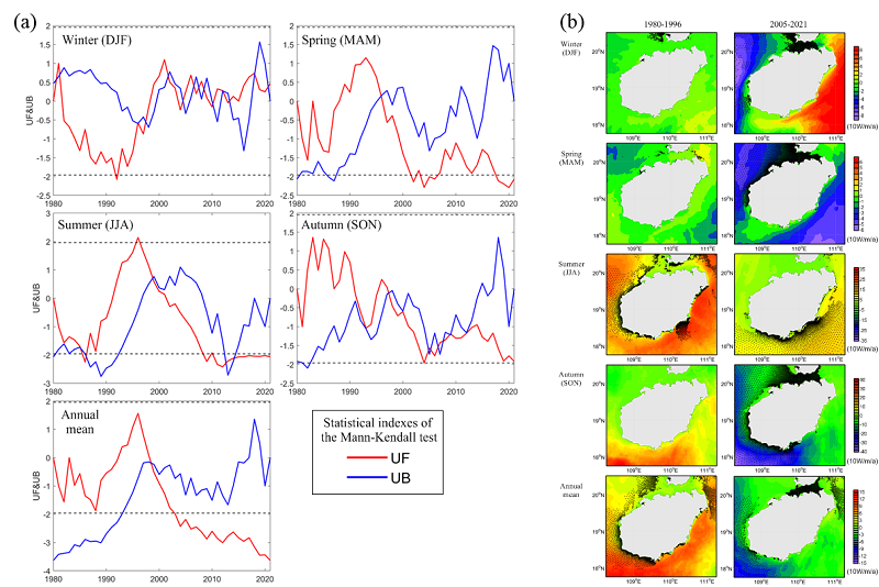 近期,中国科学院南海海洋研究所热带海洋环境实验室、热带海洋环境与岛礁生态全国重点实验室和广东省海洋遥感与大数据重点实验室施平/唐世林团队在海南岛周边海浪资源研究方面取得重要进展。相关成果以“Wave energy assessments around Hainan Island based on a fine-resolution model: the long-term trend and climatic mutation”为题,发表在国际期刊Renewable Energy上。副研究员李骏旻为论文的第一作者兼通讯作者,助理研究员李少钿、李博为共同通讯作者。其它合作者还包括研究员施平、李毅能,助理工程师陈武阳,博士后孙唯一和硕士生童一峰等。极端波高与波能密度是海洋工程设施规划与建设所依赖的关键基础参数。然而,近年来季风强度、强风频率及大洋涌浪的频繁变异,可能已引起南海波浪动力过程及其极端参数的显著变化。早前的研究更已显示,资料时限的不足会为海南岛极端波高的评估结果带来较大不确定性(Li et al.,2024)。为进一步解释此现象,本研究基于一套历时42年、空间分辨率达十米级的浪-流耦合数值模式,系统地评估了海南岛周边海域波能密度的长期变化特征。结果显示,该海域波高与波能密度的变化趋势在1999年前后发生了一次气候意义上的突变,总体由增长转为下降,并呈现出明显的季节与空间差异性(图1)。这一具有时空异质性的趋势突变,是由局地风场与远距离传入涌浪的变化共同作用所致。本研究揭示了南海波浪动力的长期演变过程与气候因子变化的紧密关联性,强调在评估波能资源与极端波高等基础参数时,必须充分考虑全球变化背景下海洋动力过程的变异特性。研究成果对南海海洋资源开发与工程设施建设具有重要的科学指导与技术支撑价值。上述研究得到国家自然科学基金、广东省自然科学基金、中国科学院南海海洋所基础前沿与创新发展项目,以及热带海洋环境与岛礁生态全国重点实验室提升原始创新能力平台项目的共同资助。图1 基于长期高分辨率数值模式对海南岛波能资源(a)突变过程和(b)相应趋势变化的诊断结果(修改自Li et al.,2026)相关论文信息:Li,J.*,Tong,Y.,Li,S.*,Chen,W.,Li,Y.,Li,B.*,Sun,W.,Shi,P. (2026). Wave energy assessments around Hainan Island based on a fine-resolution model: the long-term trend and climatic mutation,Renewable Energy,257,124807. https://doi.org/10.1016/j.renene.2025.124807Li,J.*,Li,S.*,Li,Y.,Chen,W.,Li,B.,Liu,J.,Shi,P. (2024). Evaluations of extreme wave heights around Hainan Island and their uncertainty induced by decadal variations of input variables. Ocean Engineering,294,116705. https://doi.org/10.1016/j.oceaneng.2024.116705原文链接:https://doi.org/10.1016/j.renene.2025.124807 https://doi.org/10.1016/j.oceaneng.2024.116705