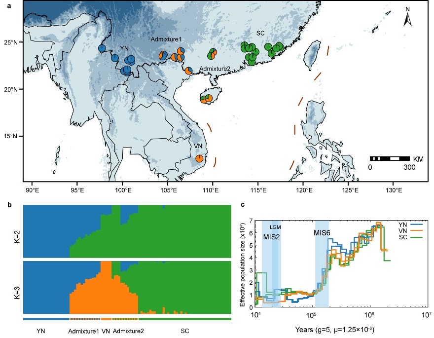 珍稀植物的存续不仅关乎单一物种的命运,更承载着生态系统功能的维系与漫长进化历史的延续。对于单种属植物而言,其种群减少或灭绝意味着整个进化谱系的衰退或消亡,对生物多样性和生态系统稳定性造成不可逆的影响。蕨类植物因其基因组大、染色体数目多、且普遍存在非整倍化和种内倍性复杂等特征,使其偏离了以二倍体为核心构建的经典遗传学理论与分析框架。传统依赖二代测序技术的研究多侧重于非编码区的中性遗传变异,在缺乏高质量参考基因组的情况下,难以区分功能性编码区变异与中性标记,限制了对自然选择、遗传负荷和适应性演化的系统评估。在保护基因组学研究背景下,整合遗传漂变、近交、自然选择等多重进化过程,对蕨类植物开展基因组尺度的研究已显得较为迫切。珍稀植物的存续不仅关乎单一物种的命运,更承载着生态系统功能的维系与漫长进化历史的延续。对于单种属植物而言,其种群减少或灭绝意味着整个进化谱系的衰退或消亡,对生物多样性和生态系统稳定性造成不可逆的影响。蕨类植物因其基因组大、染色体数目多、且普遍存在非整倍化和种内倍性复杂等特征,使其偏离了以二倍体为核心构建的经典遗传学理论与分析框架。传统依赖二代测序技术的研究多侧重于非编码区的中性遗传变异,在缺乏高质量参考基因组的情况下,难以区分功能性编码区变异与中性标记,限制了对自然选择、遗传负荷和适应性演化的系统评估。在保护基因组学研究背景下,整合遗传漂变、近交、自然选择等多重进化过程,对蕨类植物开展基因组尺度的研究已显得较为迫切。中国科学院华南植物园陈红锋研究团队和康明研究团队,联合上海辰山植物园、深圳仙湖植物园、南宁师范大学及比利时根特大学等国内外科研团队,系统解析了濒危蕨类植物苏铁蕨(Brainea insignis)的演化历史与濒危机制的基因组基础(图1)。该研究首次完成了苏铁蕨染色体级别基因组组装,组装大小达 8.62 Gb,并在此基础上开展了系统的比较基因组学与群体基因组学分析。研究发现,苏铁蕨经历了一次与整个核心薄囊蕨类共享的古全基因组加倍事件,其庞大的基因组主要由长末端重复反转录转座子(LTR-RTs)的长期积累所驱动,并整体表现出相对缓慢的进化速率。此外,苏铁蕨特有的木质茎结构适应性演化,与木质素生物合成相关基因家族的扩张及功能高度保守密切相关,这解释了为何在进化的远端分支上又出现了“树状”特征。图1. 苏铁蕨形态示意群体基因组学分析揭示了云南(YN)、越南(VN)和华南(SC)三个遗传分化谱系,当前的群体结构形成受第四纪冰期、冰后期的扩张和区域性基因流等多重历史事件的共同影响(图2)。与长期维持极小有效群体的濒危物种不同,苏铁蕨经历的是相对近期的种群衰退,导致有效群体大小急剧下降、近交水平升高以及有害突变的显著积累,遗传负荷明显加重,表明遗传清除作用尚未成为主导进化力量,当前种群正处于持续衰退阶段。进一步的环境关联分析表明,各遗传谱系已出现与气候因子相关的局部适应信号。遗传偏移模拟预测,在未来气候变化情景下,苏铁蕨种群分布将进一步碎片化,其中中南半岛西南部种群面临的灭绝风险可能最高(图3)。图2. 苏铁蕨的遗传结构和群体历史图3.苏铁蕨的适应性分化和遗传偏移分析相关研究成果以 “Decoding the genome of Brainea insignis reveals insights into fern evolution and conservation” 为题于近日发表在国际学术期刊Nature Communications(《自然-通讯》)上。该研究不仅拓展了蕨类植物基因组学研究,揭示了群体历史在塑造濒危物种遗传现状的关键作用,而且为制定维持生境连通性、促进适应性基因流的空间化保护策略提供了重要理论依据和科学支撑。中国科学院华南植物园夏增强博士研究生为论文第一作者,康明研究员、王发国研究员和Yves Van de Peer教授为论文共同通讯作者。该研究得到国家重点研发计划、广东省基础与应用基础研究旗舰项目等资助。论文链接:https://www.nature.com/articles/s41467-025-68053-0