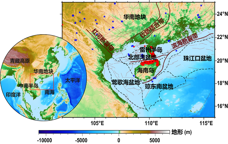 图1 北部湾及周缘区域地形,主要断裂带和晚新生代玄武岩分布。