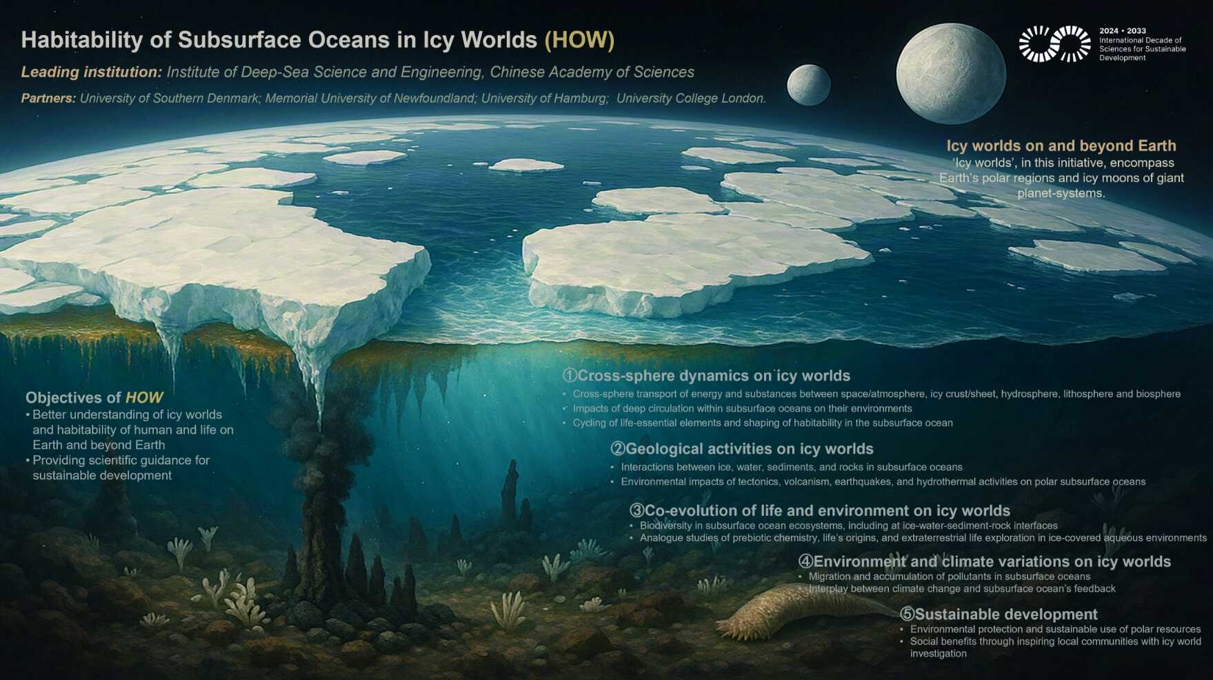 5月5日,由中国科学院深海科学与工程研究所(简称深海所)牵头的国际大科学计划“Habitability of Subsurface Oceans in Icy Worlds (HOW)”获得联合国教科文组织(UNESCO)可持续发展国际科学十年(International Decade of Sciences for Sustainable Development, IDSSD)执行委员会批准。