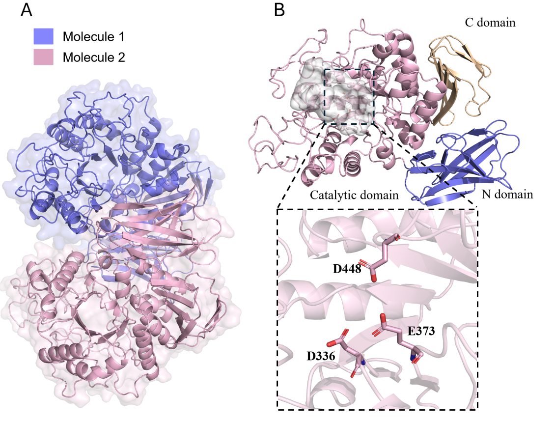 Apg属于糖苷水解酶家族13_21 (GH13_21),通常负责水解α-1,4-O-糖苷键。但其独特之处在于能有效水解结构复杂的阿卡波糖。研究解析了Apg的高分辨率晶体结构(图3):(1)Apg在溶液中以同源二聚体形式存在,单体间通过N端结构域和催化结构域呈头尾排列。(2)催化结构域采用经典的TIM桶折叠,活性位点是位于TIM桶顶部的一个突出表面凹槽,凹槽底部有一个绝对保守的催化三联体(Asp-Glu-Asp)。(3)与其他淀粉酶(如MaIZ,MaIS)相比,Apg的活性口袋裂隙更窄(7.9 Å),能紧密结合阿卡波糖,计算也显示其对阿卡波糖的结合亲和力更高。(4)结合生化实验、晶体结构和计算分析,发现两个关键的柔性环(loop A和loop B)不仅影响底物结合还决定其催化能力。