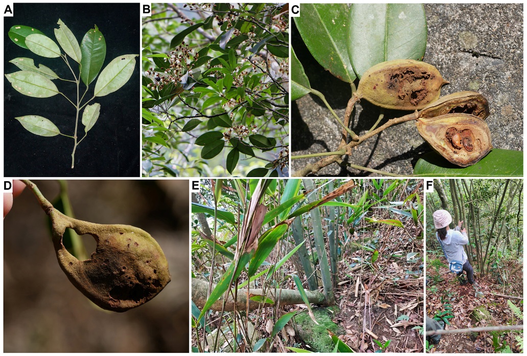 博罗红豆及其生境。(A. 叶片;B. 花;C和D. 果实受虫害状况;E和F. 茎干(呈现萌生)及其生境)
