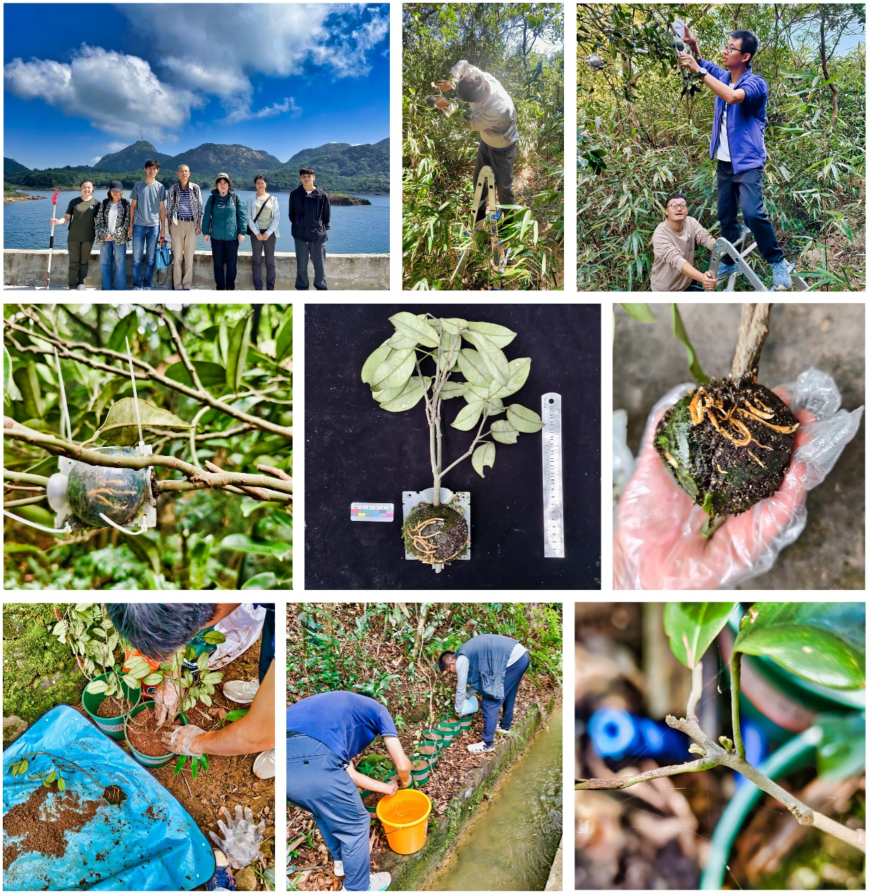 上图(从左到右):团队部分成员合影,进行高压实验和浇水;中图:高压繁殖枝条生根状况。下图:高压繁殖个体移植、管理及其萌芽状况。