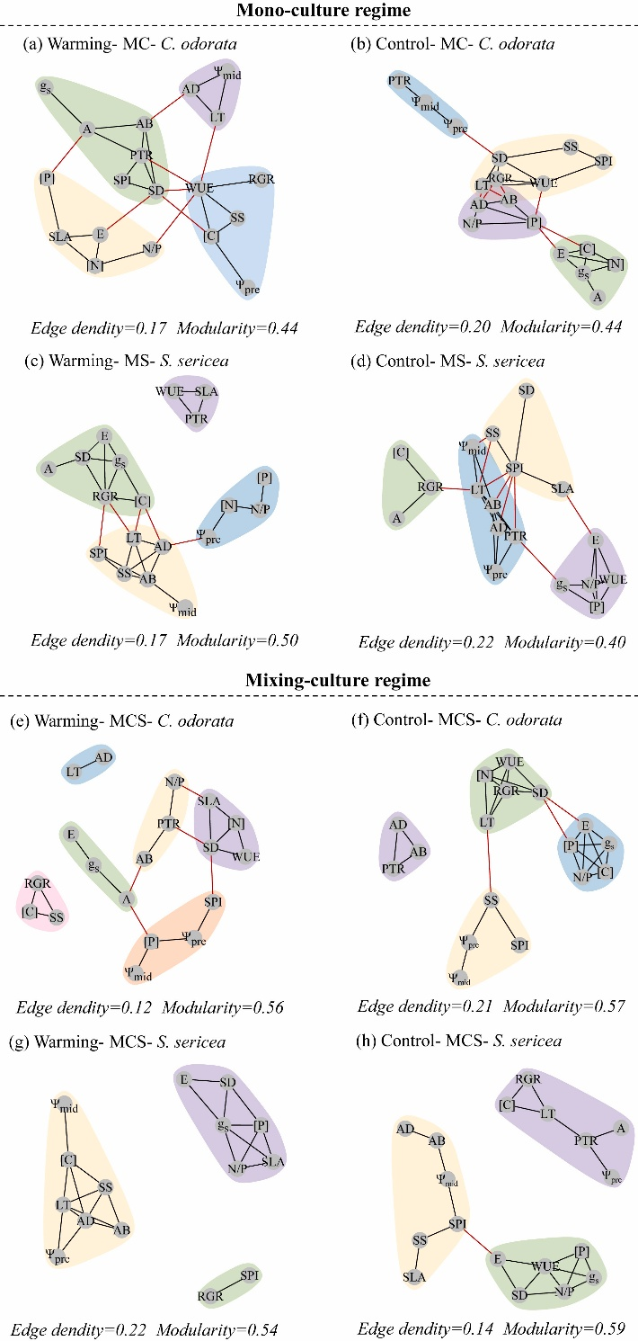图1. 夜间增温对单一种植和混合种植下飞机草和草海桐19个功能性状影响的网络图