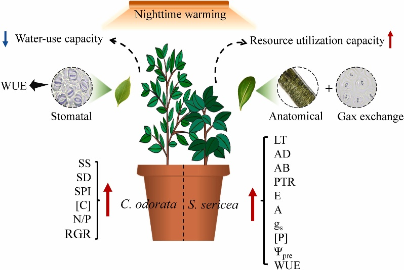 由不对称全球变暖引起的夜间增温主要表现为昼夜温差缩小。已有的研究认为夜间增温会刺激植物呼吸,导致碳净损失,对植物生长不利;然而,夜间增温对入侵植物的生理生态影响尚未明确。与大陆生境相比,热带珊瑚岛礁生境具有昼夜温差小的气候特征。近年来,入侵植物在热带珊瑚岛礁的扩张已引发诸多生态后果,探究入侵植物对热带珊瑚岛礁生境生理生态响应及其对乡土植物的影响,对热带珊瑚岛礁入侵植物防控具有重要的科学意义。