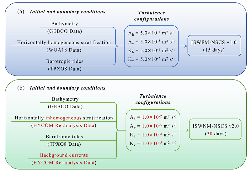 近日,中国科学院南海海洋研究所热带海洋环境与岛礁生态全国重点实验室海洋环境模拟与应用技术研究团队在南海北部内孤立波三维数值模拟研究方面取得新进展。团队推出了南海北部内孤立波数值模型的新版本(ISWNM-NSCS v2.0,图1),显著提升了内孤立波特征预报的精度与稳定性。相关成果以“ISWNM-NSCS v2.0: advancing the internal solitary wave numerical model with background currents and horizontally inhomogeneous stratifications”为题,发表在《Geoscientific Model Development》期刊上。