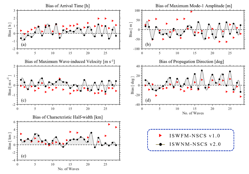 本研究在原有模型ISWFM-NSCS v1.0的基础上(Gong et al.,2023,GMD),进一步引入了背景流场和水平非均匀层化结构(图2),以更真实地刻画内孤立波的传播时间、垂向振幅、波致流速、半波宽度和传播方向等关键特征。同时,通过优化水平与垂直方向的黏性和扩散系数,在保证模型数值稳定性的前提下,有效延长了模型的预报时效;基于东沙岛附近现场观测数据对模型性能进行了系统评估,并开展了一系列敏感性试验,以分析各项更新的独立贡献。与上一代模型相比(图3),ISWNM-NSCS v2.0 在内波到达时间预报方面精度提升37%,垂向振幅精度提升34%,波致流速精度提升25%,半波宽度预报能力显著提高85%。