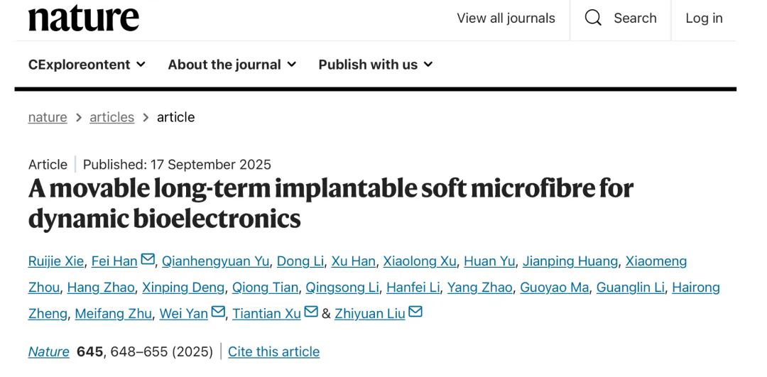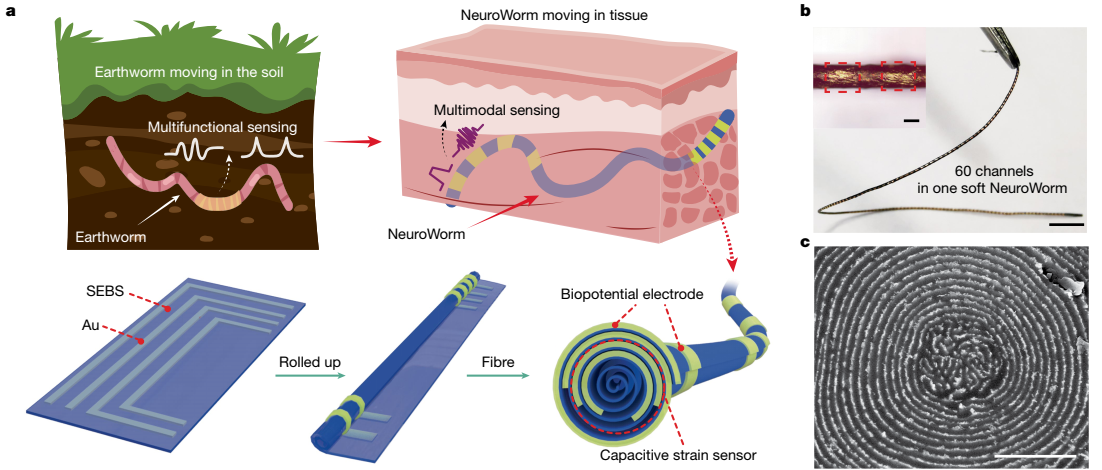 9月17日,由中国科学院深圳先进技术研究院刘志远、韩飞团队联合徐天添团队,以及东华大学严威团队,历经5年多协同攻关的研究成果在《自然》发表。研究团队成功研发出了如头发丝般纤细、柔软可拉伸、可自由驱动的神经纤维电极——NeuroWorm(神经蠕虫)。该研究首次提出了脑机接口“动态电极”的新范式,打破了植入式电极的“静态”传统,为脑机接口电极的研究与应用开辟了新方向。