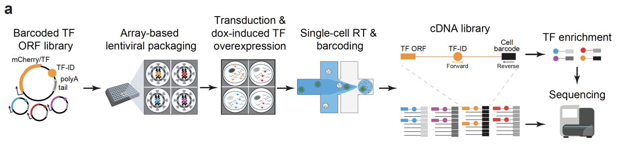 巧妙利用Tet-on启动子内在噪音和逆转录病毒基因组不同整合位置表达活性差异,进一步结合高滴度病毒转导的拷贝数差异(有别于传统大规模扰动中常用的低滴度方式)。这种设计使得即使单一Doxycycline浓度下,转基因的剂量也可以达到平均60倍,最高1000倍的极宽剂量分布。并结合3’scRNA-seq兼容的条形码,定量解析转录因子剂量与转录组变化之间的对应关系,从而首次在大规模基因扰动背景下实现了“剂量敏感”的功能解析。