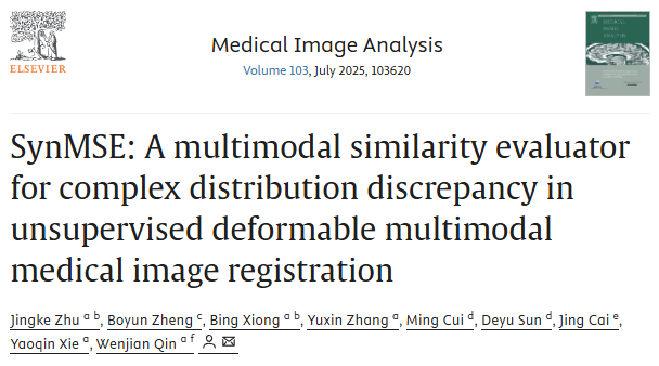 近日,中国科学院深圳先进技术研究院医工所秦文健研究员团队针对无监督配准算法在复杂多模态场景中面临的挑战,创新性提出了一种新的多模态相似性评估器(SynMSE),有效解决了配准过程中的分布差异难题。该成果以"SynMSE: A multimodal similarity evaluator for complex distribution discrepancy in unsupervised deformable multimodal medical image registration"为题,发表在医学图像分析领域知名期刊 Medical Image Analysis上。