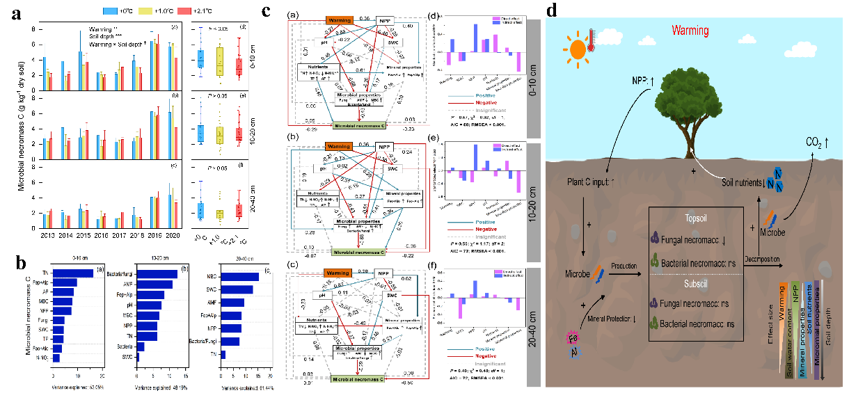 研究人员依托鼎湖山站于2012年建立的生态系统水平被动增温实验平台,进行了为期8年的连续采样,分析了南亚热带森林土壤微生物残体对生态系统水平增温的响应模式及驱动机制。结果表明,随着增温幅度的增加,南亚热带森林土壤微生物残体下降。与未增温(+0℃)处理相比,+2.1℃的增温使表层(0-10 cm)土壤微生物残体下降约23%(主要是由于真菌残体碳的损失),其约占表层土壤总有机碳损失的48%。然而,底层土壤(20-40 cm)微生物残体碳对增温的响应不敏感。进一步分析表明,增温下表层土壤微生物残体碳的损失主要与增温刺激的植物与微生物氮竞争导致的土壤氮含量降低有关,而底层土壤微生物残体对增温的响应不敏感则与底层土壤更强的矿物保护作用以及更稳定的微生物群落有关(图1)。
