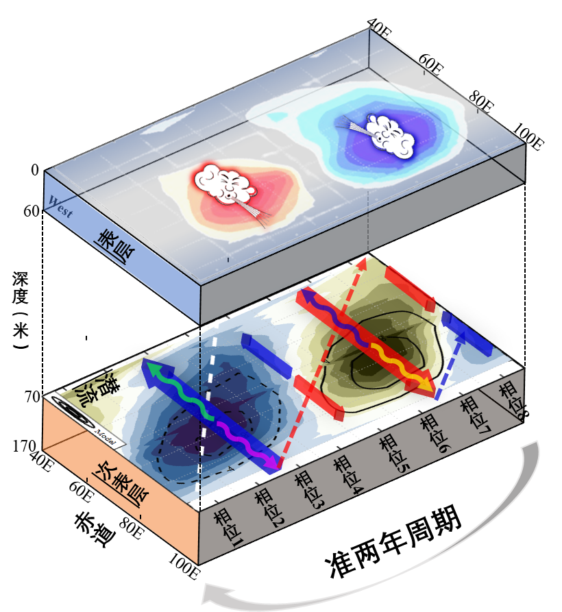 图2:印度洋偶极子的固有振荡通过风场–温跃层的耦合作用,驱动赤道潜流发生复杂的位相演变及准两年波动响应的机制示意图