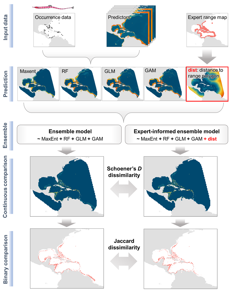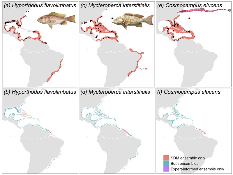 首先,研究团队以196种海洋鱼类(海龙科、石斑鱼科等)为研究对象,基于物种分布点记录,利用四种算法分别构建物种分布模型,并进一步采用机器学习中的meta learner方法,创新性地在模型中整合了IUCN专家绘制的物种分布范围信息(图1)。研究结果显示,整合专家知识的物种分布模型显著提升了预测结果的合理性,有效避免了传统模型在地理屏障的过度预测(图2)。进一步分析发现,专家信息的整合效果与物种分布范围、分布点数量等因素显著相关。