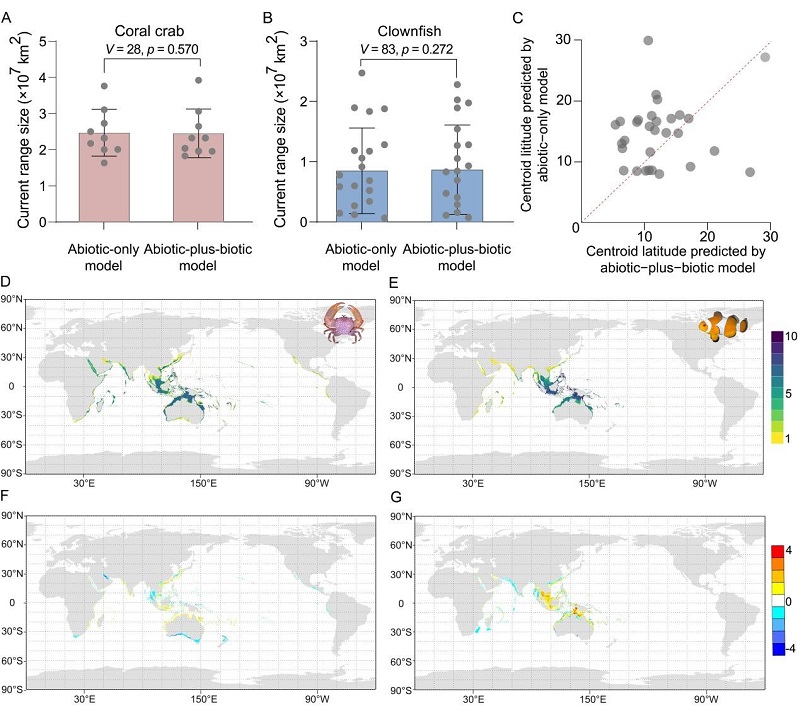 同时,研究团队以广泛分布于热带珊瑚礁的小丑鱼–海葵和珊瑚蟹–珊瑚两类典型共栖组合为研究对象(图3),将共栖关系纳入物种分布模型,评估未来气候变化背景下海葵和珊瑚两类宿主对共栖生物地理分布格局的影响。研究发现,纳入共栖关系后,小丑鱼、梯形蟹的当前地理分布会向低纬度偏移(图4)。同时,共栖关系可能会放大未来气候变化对小丑鱼、梯形蟹地理分布的影响,其中,珊瑚对气候变化的敏感性更高,导致共栖的珊瑚蟹的未来分布收缩更为显著。