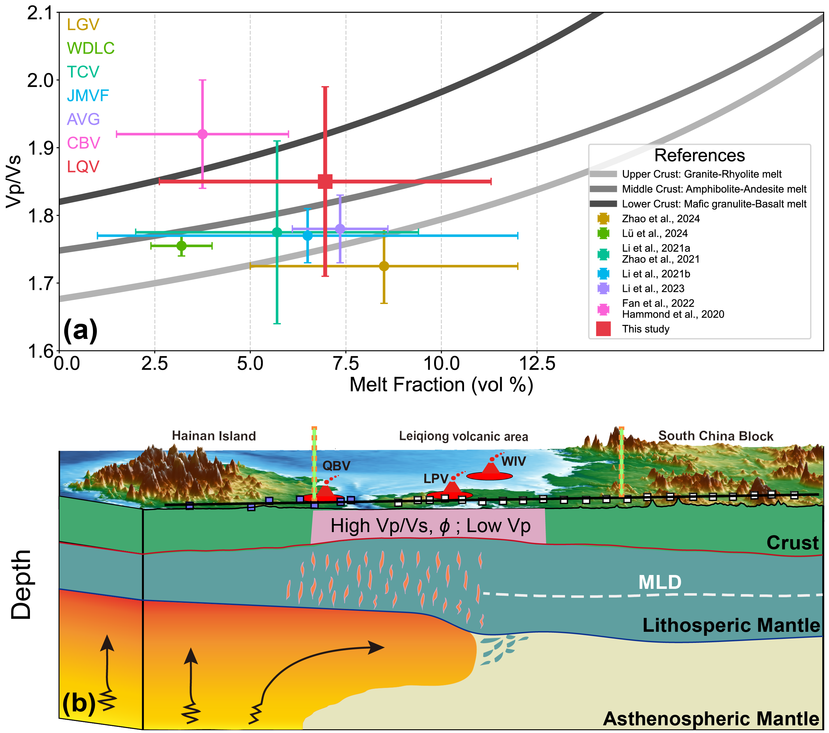 图3. (a)国内典型火山区地壳熔体分数的对比图。(b)雷琼火山区岩石圈改造与岩浆系统特征的概念模型图。绿橙条带标示剖面沿线的华南陆块、雷琼火山区与海南岛分界。