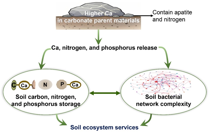 基岩作为关键带的下边界,深刻塑造着土壤性质与功能。一方面,基岩类型和风化通过矿物释放和养分供给影响土壤结构和养分来源;另一方面,基岩化学组成通过调节土壤理化环境,进而塑造微生物群落结构和功能,影响土壤固碳和养分固持等关键土壤功能。富钙基岩(或成土母质)在全球广泛分布,涵盖碳酸盐岩、硅酸盐岩(如富钙变质岩)等,具有多样的风化特征。其中,碳酸盐岩风化速率显著高于其它富钙基岩,可能在较短时间尺度上对土壤功能产生更强的调控作用。尽管已有研究揭示了喀斯特碳酸盐岩对特定土壤功能(如碳固定)的影响,但尚缺乏将基岩-微生物-土壤功能耦合的机制框架。