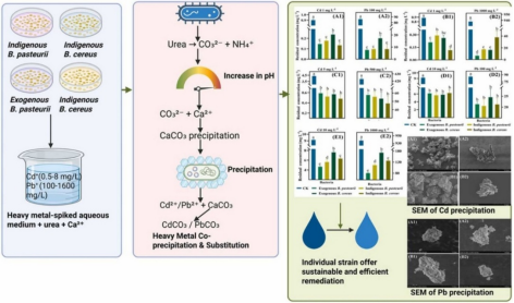 随着工业化和农业活动的持续扩张,重金属镉和铅对水体和土壤的污染已演变为一项严峻的全球性环境挑战。这些有毒金属不仅具有环境持久性和高生物毒性,更易通过食物链富集,严重威胁生态系统稳定与农产品安全。在众多绿色、可持续的原位生物修复技术中,微生物诱导碳酸盐沉淀技术(MICP)因其环境友好、成本相对较低且能实现长效稳定等优势而备受关注。由于实际污染场地中镉、铅等重金属往往同时存在,它们之间可能产生协同、拮抗或竞争抑制等复杂的交互作用,这些相互作用会深刻影响微生物的活性、矿化效率以及最终修复效果的稳定性。若忽视这一复杂情境,仅基于单一污染体系优化的技术在实际应用中难免会“水土不服”。因此,深入探索MICP技术在镉-铅复合污染条件下的作用效率与微观机制,对于精准治理复杂污染场地具有至关重要的现实意义。