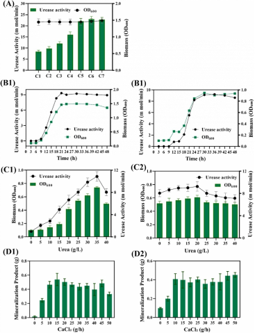 图2. 本土矿化菌菌株的驯化过程和最佳培养条件筛选