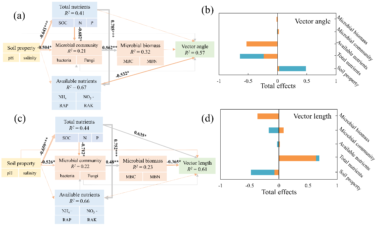 图3. 土壤性质、土壤养分以及微生物性质对微生物养分限制的主要影响途径
